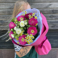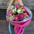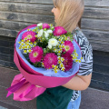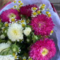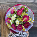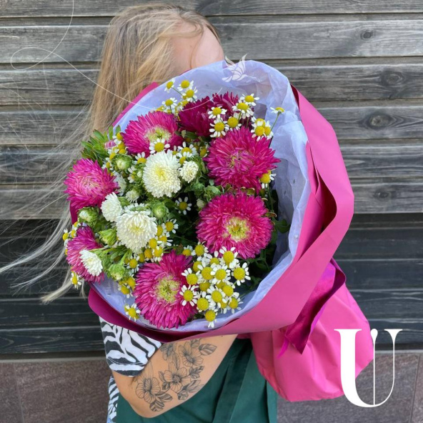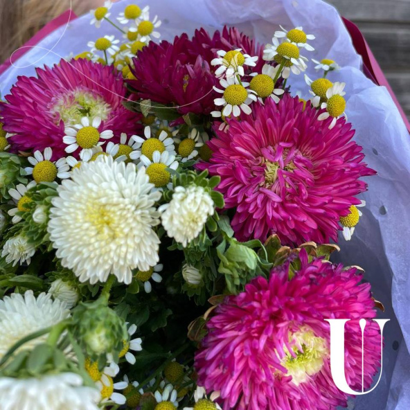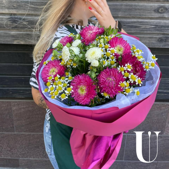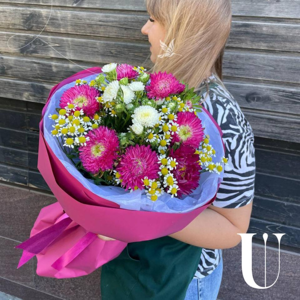 Этот круглый букет в малиново-белой гамме с астрами кустовыми и матрикариями наполнен яркими летними красками. Он сочетает в себе нежность белых цветов и яркость малиновых оттенков, создавая атмосферу свежести и радости. Астры и матрикарии добавляют в букет нотки загадочности и загадочной красоты летнего сада.