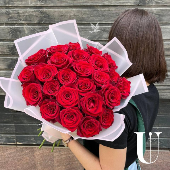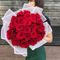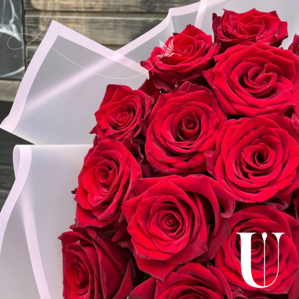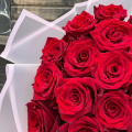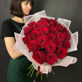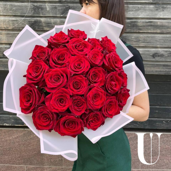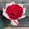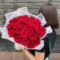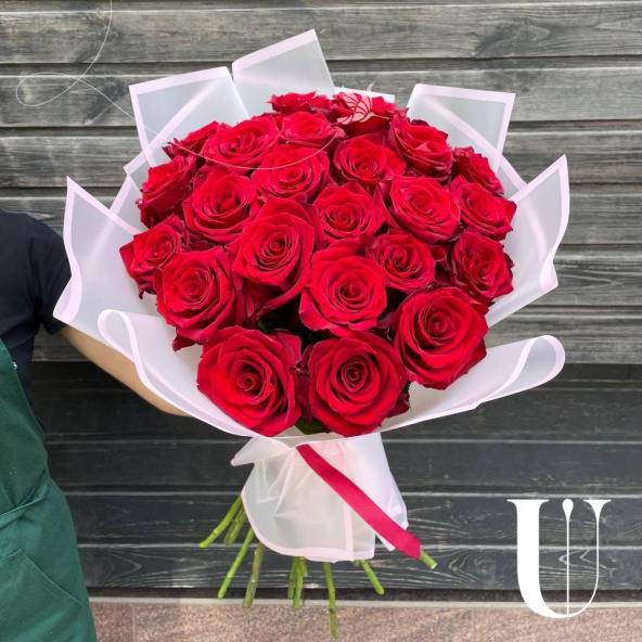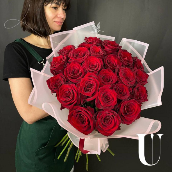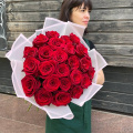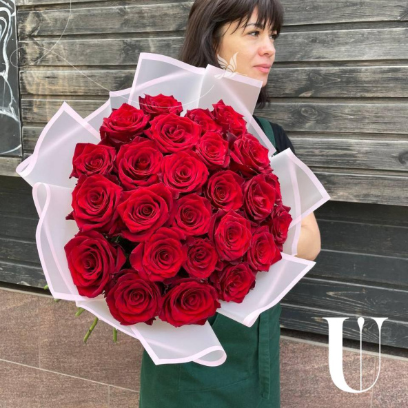 Букет из красных роз, символизирующий страсть и любовь, идеальный подарок для выражения глубоких чувств. Этот круглый букет создан для того, чтобы восхитить и поразить своей красотой. Каждый цветок словно загорается внутренним огнем, наполняя комнату атмосферой романтики и страсти.