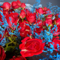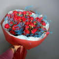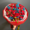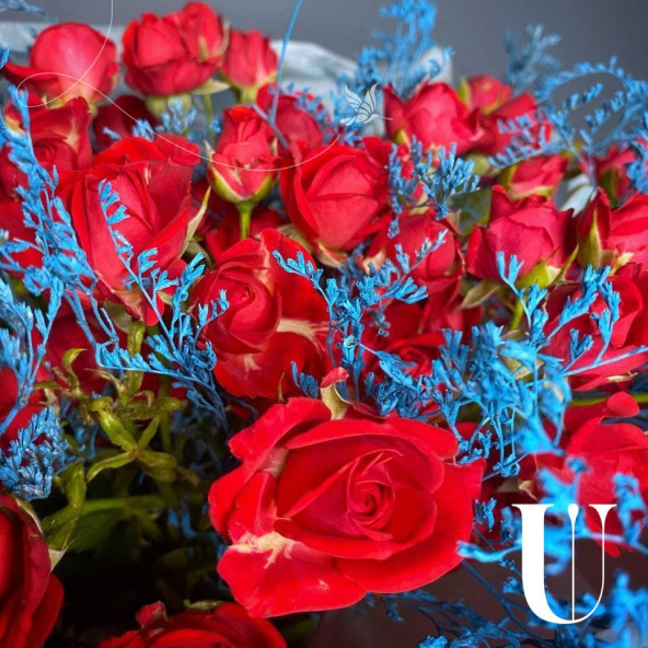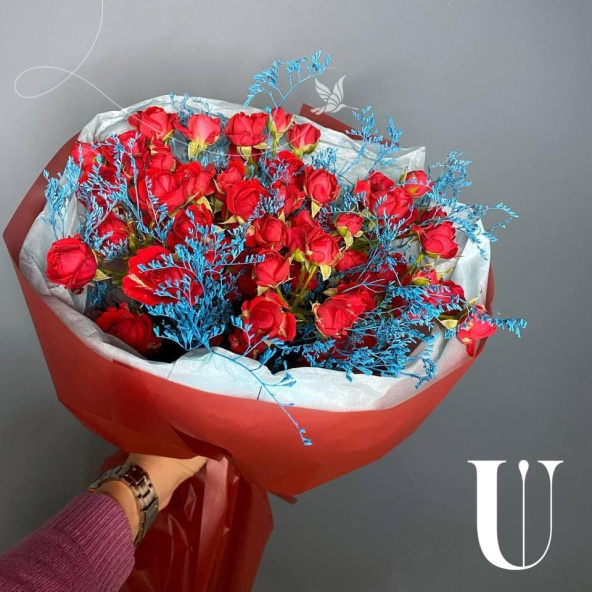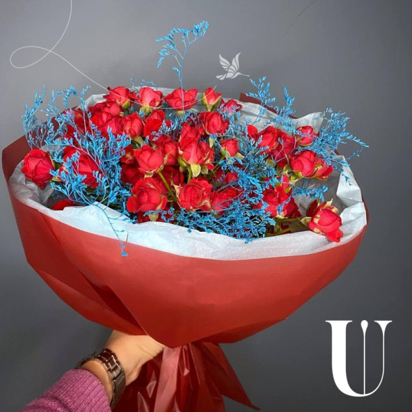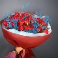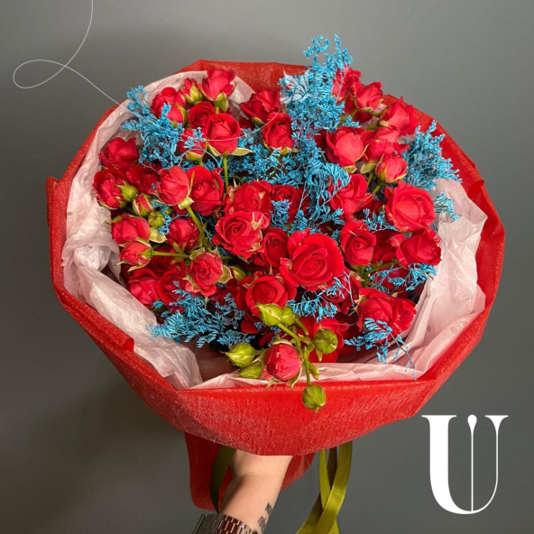 Букет из кустовых роз и кермека в необычном красно-голубом сочетании и красной яркой упаковке.