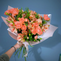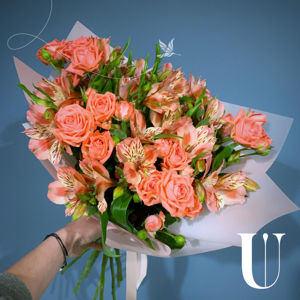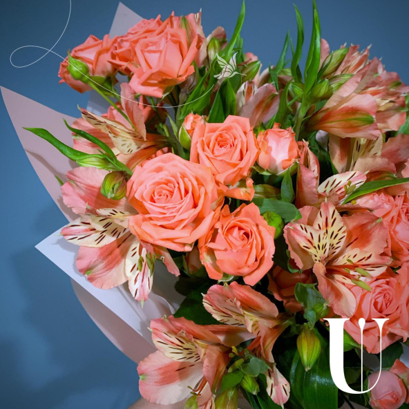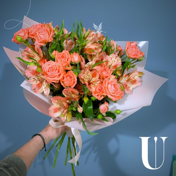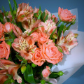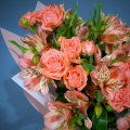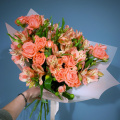 Это элегантный букет, который состоит из прекрасных кустовых роз и нежных альстромерий в персиковых тонах. Букет будет радовать глаз своей красотой и приятным ароматом.