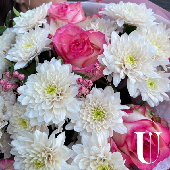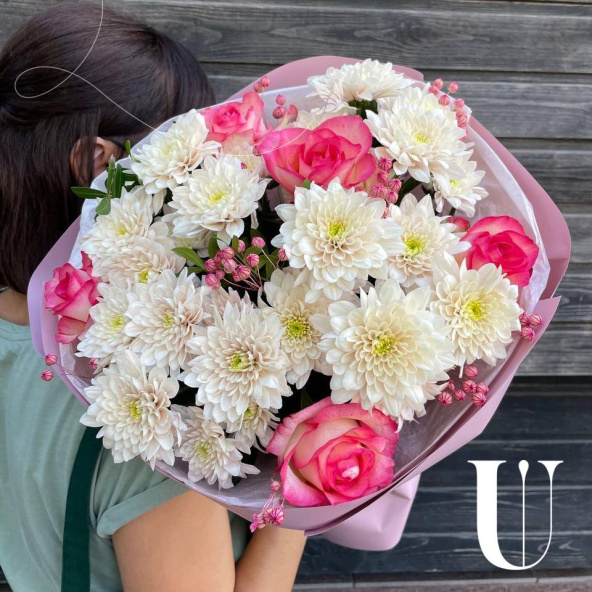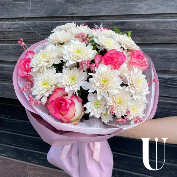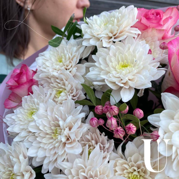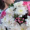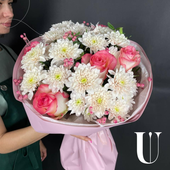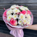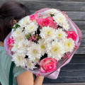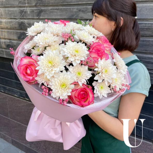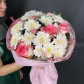 Свежесть летнего утра передана в этом круглом букете с хризантемой кустовой, розами и леном, наполняя пространство нежными ароматами и яркими красками. Этот букет прекрасно подойдет для создания атмосферы легкости и радости, олицетворяя красоту и свежесть летнего сезона. Подарите этот букет и подарите радость и яркие эмоции!