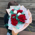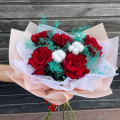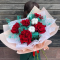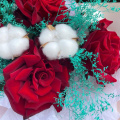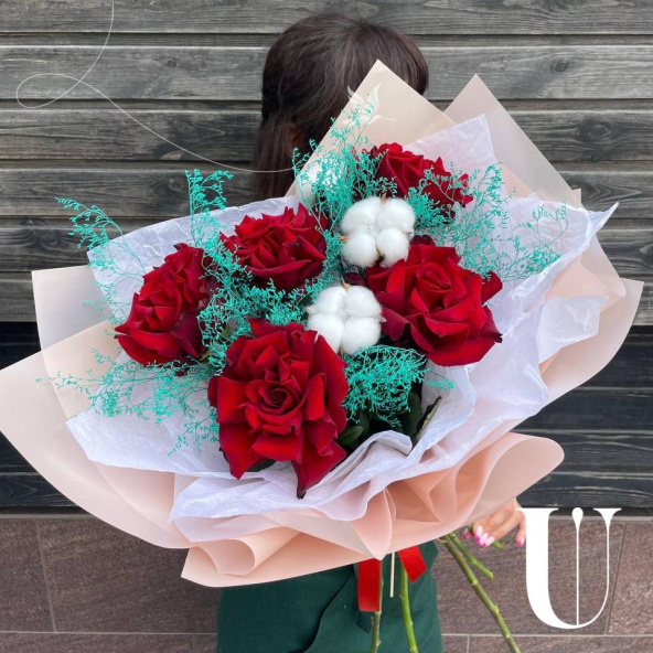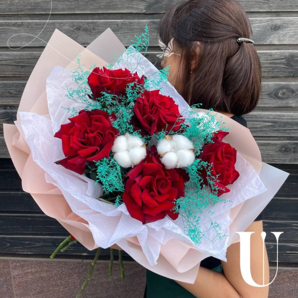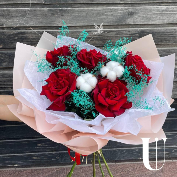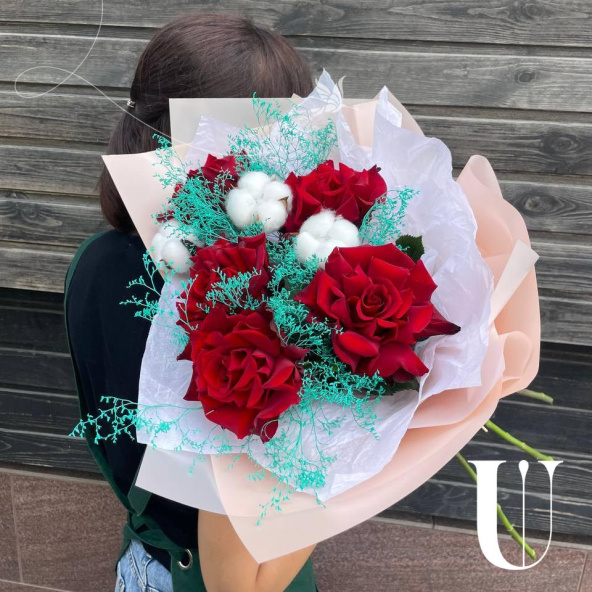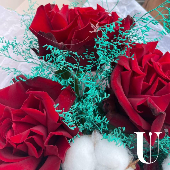 Этот утонченный букет состоит из красных роз, которые символизируют страсть и любовь, белого хлопка, придающего букету нежность и чистоту, а также бирюзового кермека, добавляющего штрих загадочности и таинственности. Этот букет идеально подойдет для тех, кто ценит красоту и оригинальность, создавая впечатление неповторимой и завораживающей композиции.