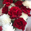 Букет воплощает в себе сочетание красных и белых цветов - роз и хризантем, создавая атмосферу страсти, нежности и романтики.